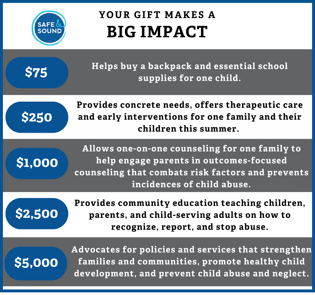 Your gift as a Safe & Sound community member wraps all of this support around every family that comes Safe & Sound with hope of a better future for themselves and their children. Thank you for being a partner in our mission to prevent and reduce the impact of childhood abuse, neglect and trauma.